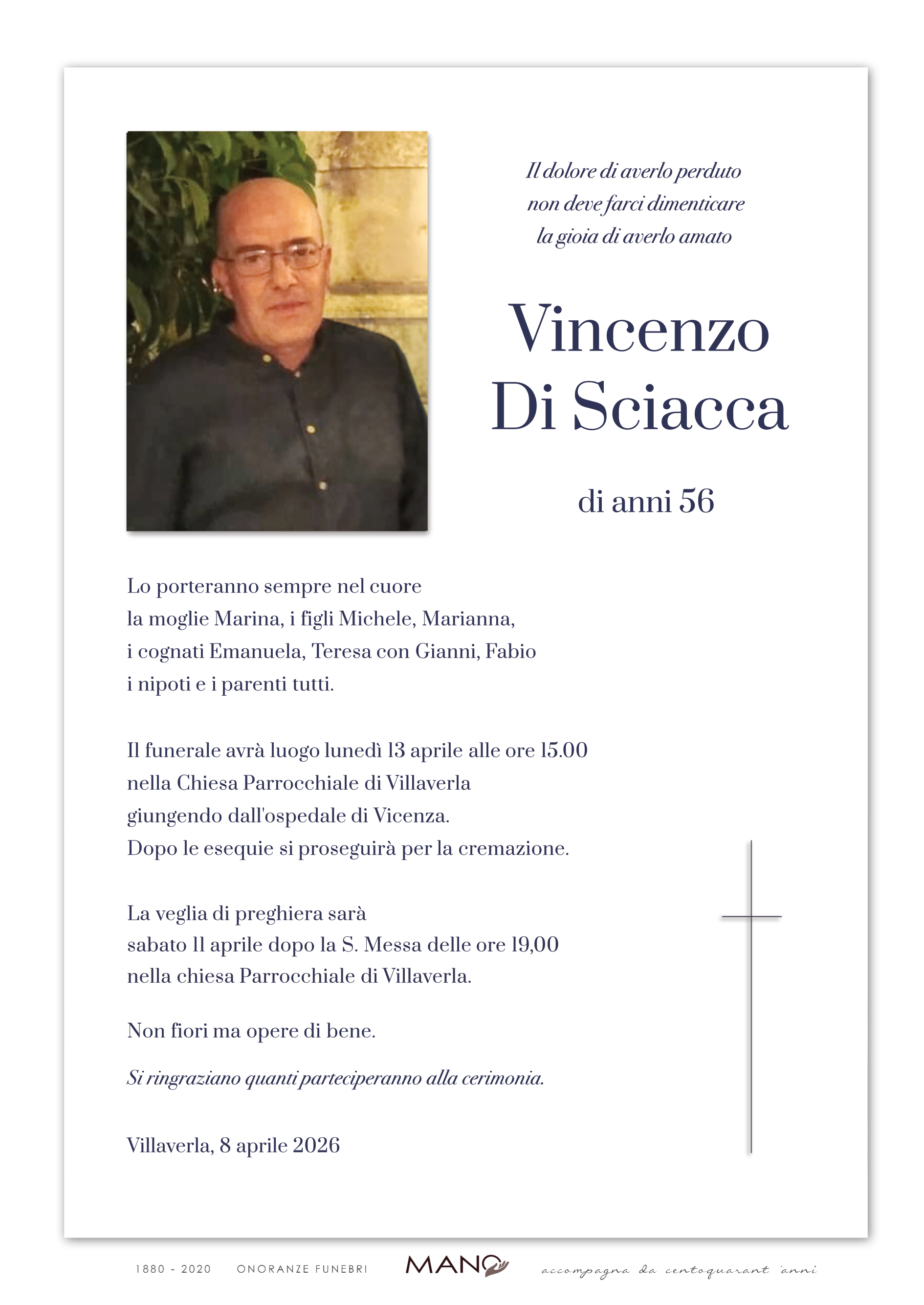 Buongiorno. Ho saputo solamente ora del fatto. Mi dispiace moltissimo. Vincenzo l'ho conosciuto nell'ambito lavorativo ed ho avuto l'onore di instaurare un bel rapporto cordiale e di stima reciproca. Persona con la schiena dritta che non perdeva mai la calma anche nei momenti in cui avrebbe avuto ragione di spazientirsi. Porterò sempre il ricordo tuo. Ciao Vincenzo. Il mio cordoglio va alla famiglia. Un abbraccio forte a tutti.